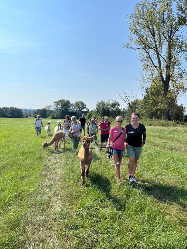 Gemeinsam mit der Familie Liebermann, die ihren Hof mit viel Liebe und Engagement betreiben und den Alpakas sind wir dann über die Wiesen gegangen. Die Alpakas bringen einen dazu, sehr achtsam und bewusst zu gehen – genau das Richtige, um dem Alltag ein bisschen zu entfliehen. Während einer ausgiebigen Futterpause blieb genügend Zeit zum persönlichen Austausch in einer lockeren Atmosphäre – das ist für die Gruppe sehr wichtig.